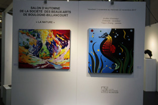 Exposition Espace Landowsky du 3 au 22 novembre 2017. La Société des Beaux-Arts a tenu son Salon d’Automne du 3 au 22 Novembre 2017. Plus de soixante participants, peintres, sculpteurs, photographes… y ont présenté leurs œuvres sur le thème « la Nature ». Chaque artiste en exprimant son art au travers de ses œuvres a su toucher le cœur du public. L’invitée d’honneur est une femme sculpteur, Florence Chésade. Sculpteur officiel du Musée de la Marine à Paris au sein duquel elle vient d’exposer, en Janvier dernier, une série de bronzes représentant le monde marin. Elle a été lauréate de plusieurs prix au Musée National de la Marine, et obtenu une médaille d’or au Salon des Artistes animaliers ainsi que le prix Sandoz au Salon National d’Art Animalier. Le deuxième invité d’honneur est Taijun Zheng, peintre mystique bouddhiste chinois qui a exécuté devant le public une « Performance » en réalisant en un temps record de six minutes un immense tableau (2.60 X 5 m). Œuvre unique représentant un paysage à l’aide d’un gros pinceau de calligraphe conformément aux exigences de l’art de la calligraphie